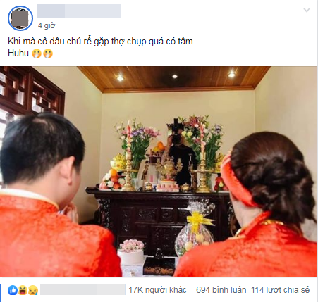 "Nhìn lên cái bàn thờ mà giật hết cả mình, ông chụp ảnh cũng liều thật, dám chui vào tận đó để đứng, chắc cô dâu chú rể cũng phải vái lạy ông luôn".