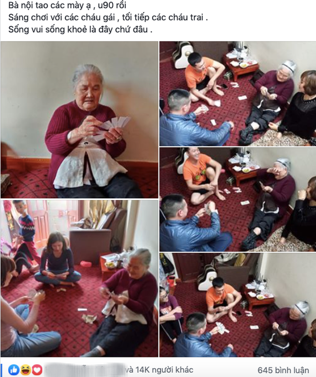 "Bà nội mình đấy các bạn ạ, U90 rồi. Sáng chơi với các cháu gái, tối tiếp các cháu trai. Sống vui sống khoẻ là đây chứ đâu" - tài khoản Tuấn Mạnh đăng tải.
