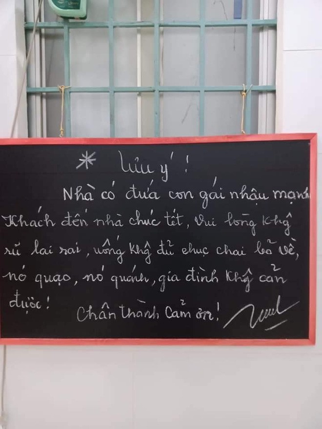 Chủ nhân câu chuyện chia sẻ trên mạng xã hội: “Bà ngoại tui đã bựa mà còn ghi chữ còn đẹp và đều hơn tui”, kèm với đó là hai bức ảnh thu hút mọi sự chú ý. Trên tấm bảng đen, ngoại viết phấn trắng: “Lưu ý! Nhà có đứa con gái nhậu mạnh. Khách đến chúc Tết vui lòng không rủ lai rai, uống không đủ chục chai bỏ về, nó quạo, nó quánh, gia đình không cản được".