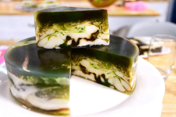 Món thạch rau câu này được đổ từ 3 màu chính là trắng, nâu và xanh lá cây tượng trưng cho "sơn” là núi rừng và "thủy” là nước, vậy nên mới có tên gọi khá kêu là thạch sơn thủy.