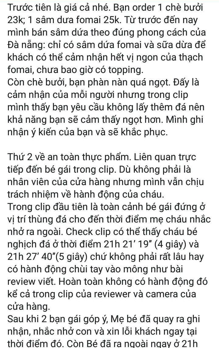 "Đầu tiên, mình xin đính chính bé gái trong clip không phải là bé Nhím (con gái mình) và người tiếp hai bạn gái reviewer là chị của mình. Anh chị và cháu đi ngang qua cửa hàng, thấy đông khách nên hỗ trợ.