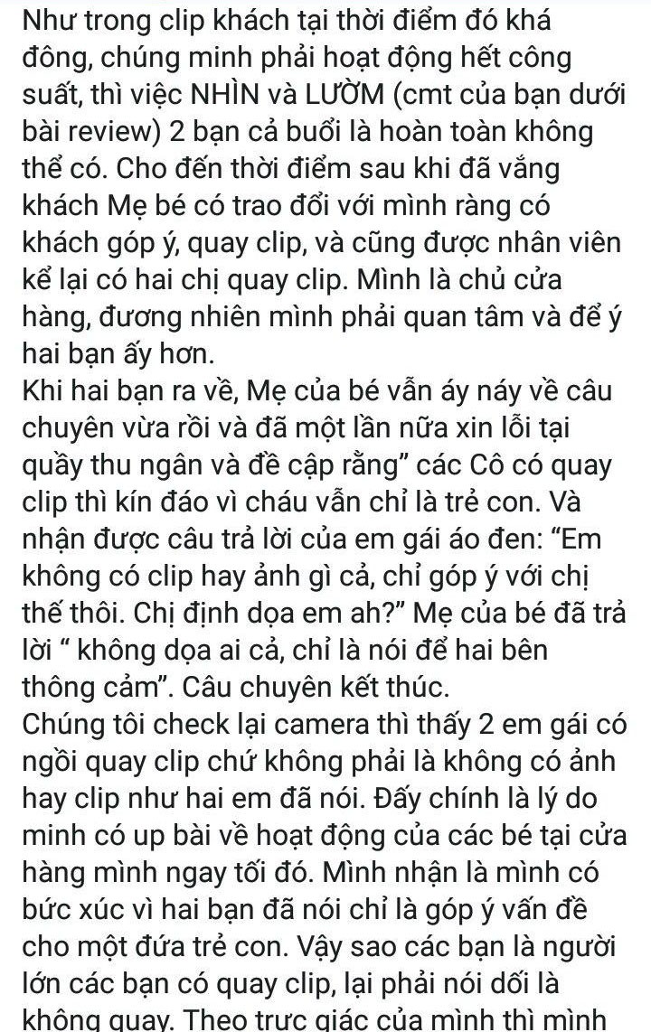 "Chúng tôi check lại camera thì thấy 2 em gái có ngồi quay clip chứ không phải là không có ảnh hay clip như hai em đã nói. Đấy chính là lý do mình có up bài về hoạt động của các bé tại cửa hàng mình ngay tối đó.