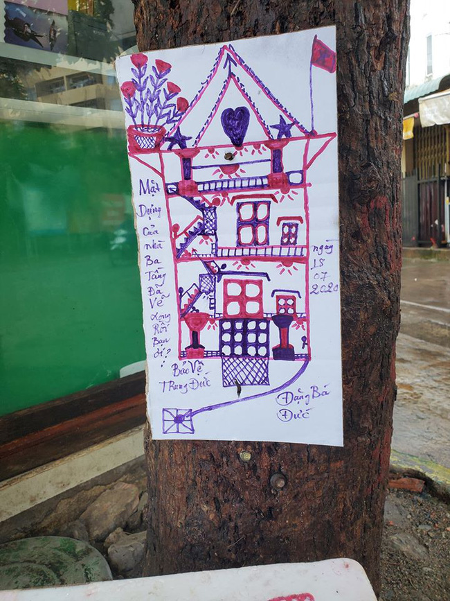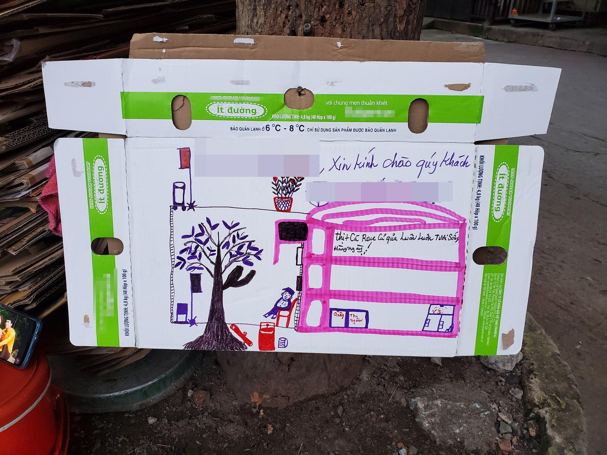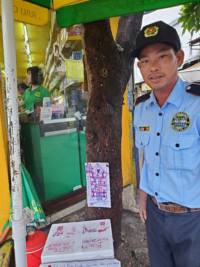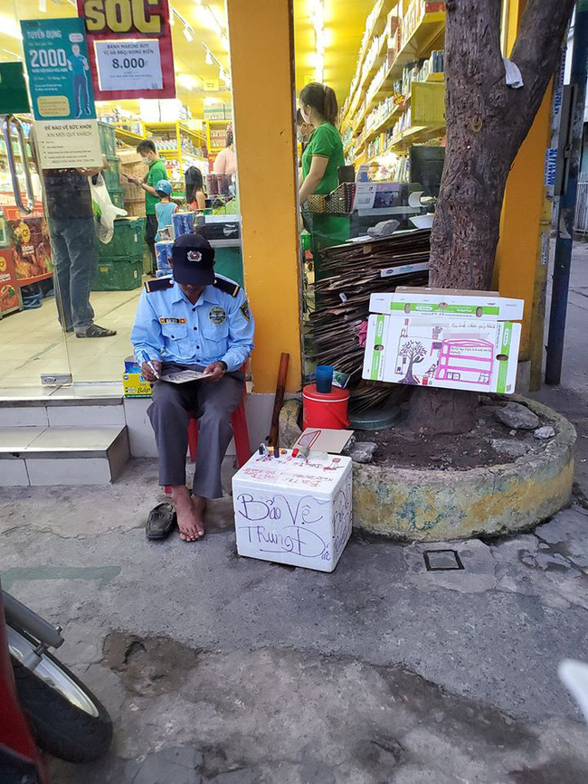 Hỏi ra mới biết bác bảo vệ tên Đức Trung, tuy nhìn thì trẻ vậy nhưng đã 49 tuổi rồi, hàng ngày bác Trung vừa làm bảo vệ tại cửa hàng vừa kiêm "họa sĩ" này vẽ từ hộp xốp đến vỏ bìa carton, chủ đề cũng vô cùng gần gũi như vẽ lại cửa hàng, chậu hoa hay những lời ghi chú dí dỏm.
