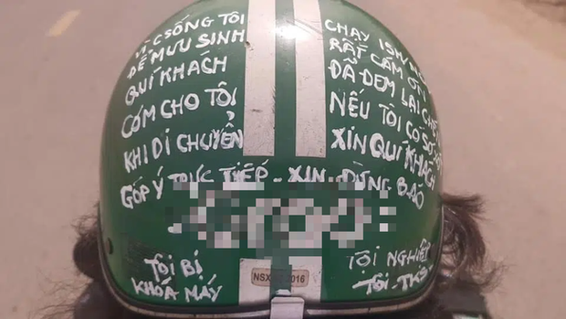 Nội dung ghi trên nón cụ thể và rõ ràng, mặc dù cảm ơn nhưng bác tài cũng không quên gửi lời nhắn nhủ đến các vị khách của mình: "Xin đừng báo công ty. Tôi bị khóa máy, tội nghiệp tôi".