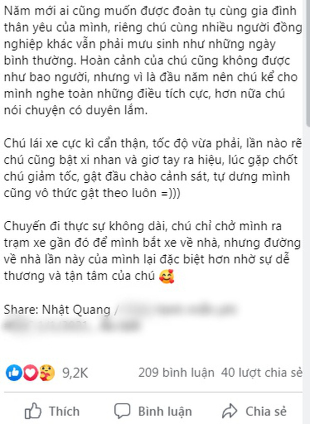 Kèm theo bức ảnh chụp chiếc nón bảo hiểm đầy lời chia sẻ của bác tài là câu chuyện được một vị khách kể lại sau khi đi cuốc xe này: Theo vị khách này, bác tài trên chạy xe vô cùng cẩn thận, tốc độ vừa phải, tuân thủ các hiệu lệnh giao thông. Bên cạnh đó, khi gặp chốt bác tài này còn chào gật đầu chào cảnh sát rất dễ thương.
