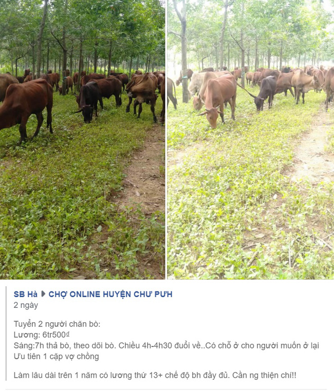 Theo đó, bài đăng tuyển người chăn bò gây chú ý với mức lương 6.500.000 đồng. Giờ làm việc từ 7h sáng đến 16h30 chiều, nhiệm vụ của người chăn bò chỉ đơn giản là theo dõi bò. Với chế độ đãi ngộ hấp dẫn như: Có chỗ ở cho người làm, lương tháng 13, chế độ bảo hiểm xã hội đầy đủ.
