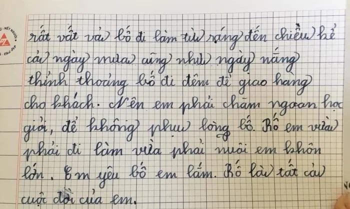 Em thương bố lắm. Em sẽ học thật giỏi để bố vui. Em mong sau này lớn lên em có thể giúp bố đỡ khổ. Bố là người hùng trong tim em.”