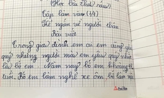 "Nhà em có 4 người nhưng người em thương nhất là bố. Bố em đi làm xe ôm, ngày nào cũng đi từ sáng sớm đến tối mịt.