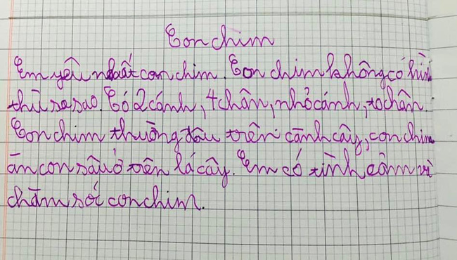 Dù bài văn chỉ có vỏn vẹn 6 câu mà câu nào cũng phải có "con chim". Đã vậy con chim còn "không có hình thù ra sao", thậm chí phải có những 4 chân mới chịu.