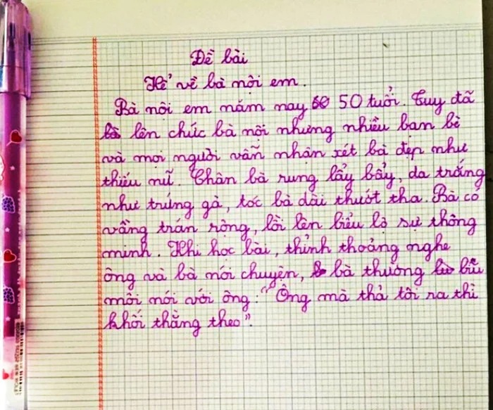 Bài văn gây chú ý với đoạn miêu tả về bà nội 50 tuổi: "Tuy đã lên chức bà nội nhưng nhiều bạn bè và mọi người vẫn nhận xét bà đẹp như thiếu nữ". Hình ảnh bà hiện lên sống động qua từng câu chữ: "Chân bà rung lẩy bẩy, da trắng như trứng gà, tóc bà dài thướt tha. Bà có vầng trán rộng, lồi lên biểu lộ sự thông minh."