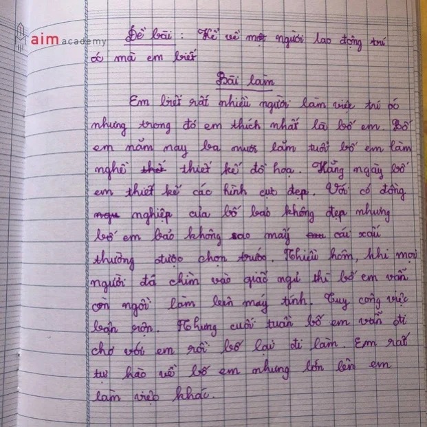 Tuy nhiên, chính câu kết của bài văn mới là điểm nhấn khiến mọi người "phì cười": "Em rất tự hào về bố em nhưng lớn lên em làm việc khác." Sự thẳng thắn, hồn nhiên của trẻ thơ đã tạo nên một pha "bẻ lái" cực gắt, thể hiện đúng bản chất nghĩ gì viết nấy của lứa tuổi này.
