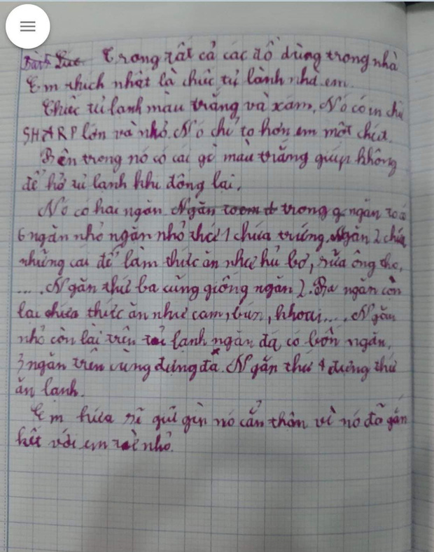 Đọc qua bài viết, có thể thấy cậu học trò đã quan sát chi tiết từng thứ xung quanh chiếc tủ lạnh nhà mình để tả lại trong bài viết. Từ tên hãng của tủ lạnh đến bao nhiêu ngăn, từng ngăn chứa gì đều được cậu bé tả lại một cách chi tiết.