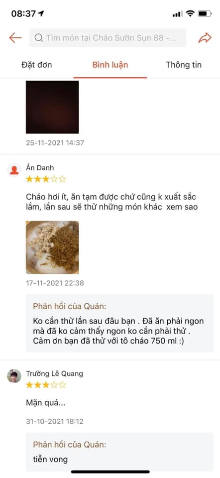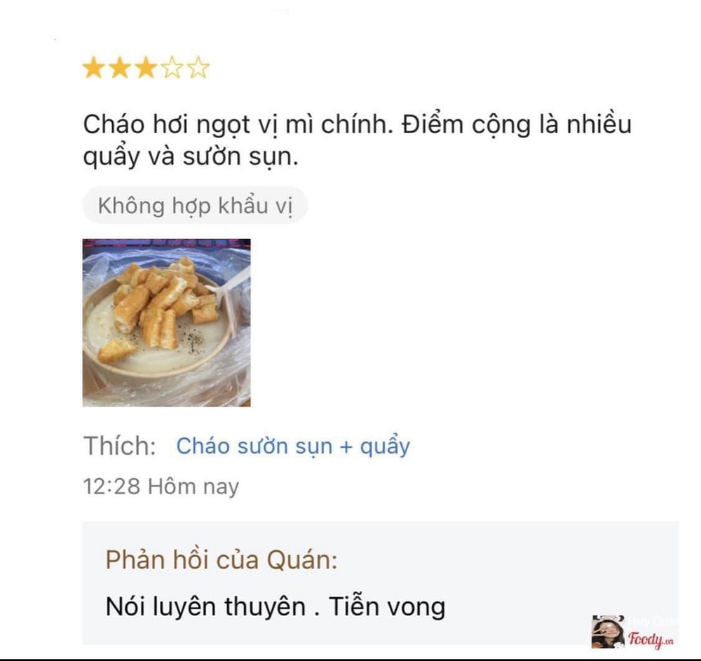 Mới đây, một quán cháo đã khiến nhiều người phải lắc đầu vì thái độ bán hàng quá kém. Theo thông tin, quán cháo này có địa chỉ tại Minh Khai, Hà Nội. Một khách hàng sau khi đặt mua và sử dụng cháo thấy không hợp khẩu vị bèn đánh giá qua ứng dụng điện thoại. Ngôn ngữ của vị khách này khá lịch sự, có tính xây dựng: "Cháo hơi ngọt vị mì chính. Điểm cộng là nhiều quẩy và sườn sụn".