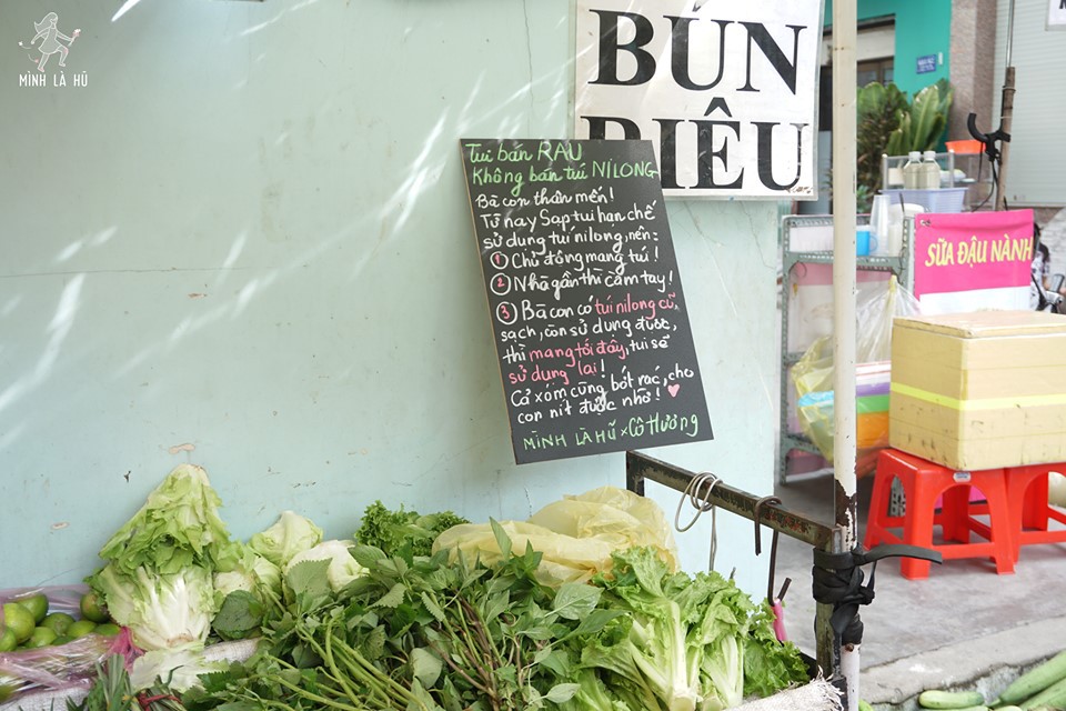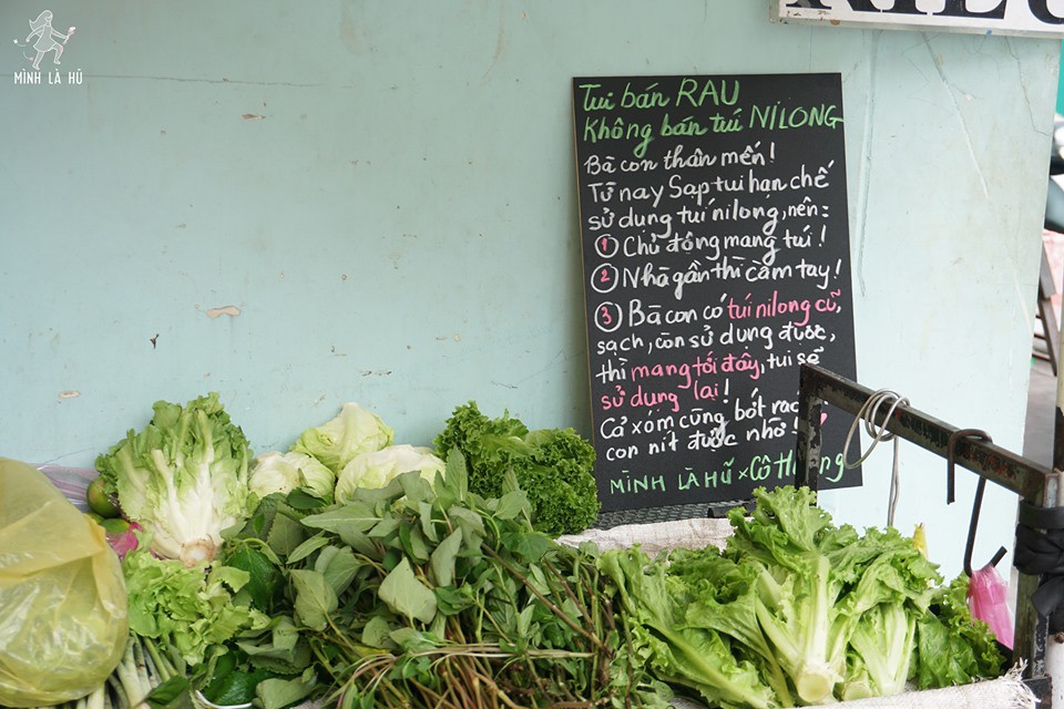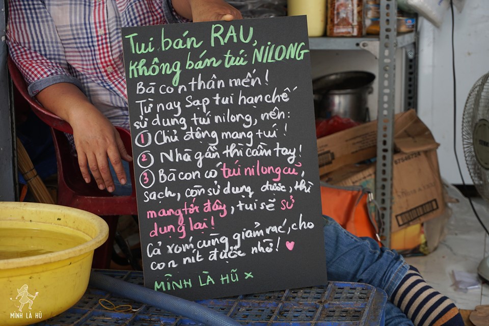 Hũ chia sẻ: "Sau khi nói chuyện với 3 cô/chị bán rau, Hũ quyết định: Sẽ làm tặng chị và cô mỗi người một tấm bảng để khách hàng có thể chú ý hơn, tiện đó những người nào có ý thức sẽ tự mang giỏ đi chợ hoặc cầm tay, hơn hết nhà ai có bao nilon cũ, còn sạch và dùng được thì mang tới cô sẽ tiếp tục sử dụng cho người tiếp theo.