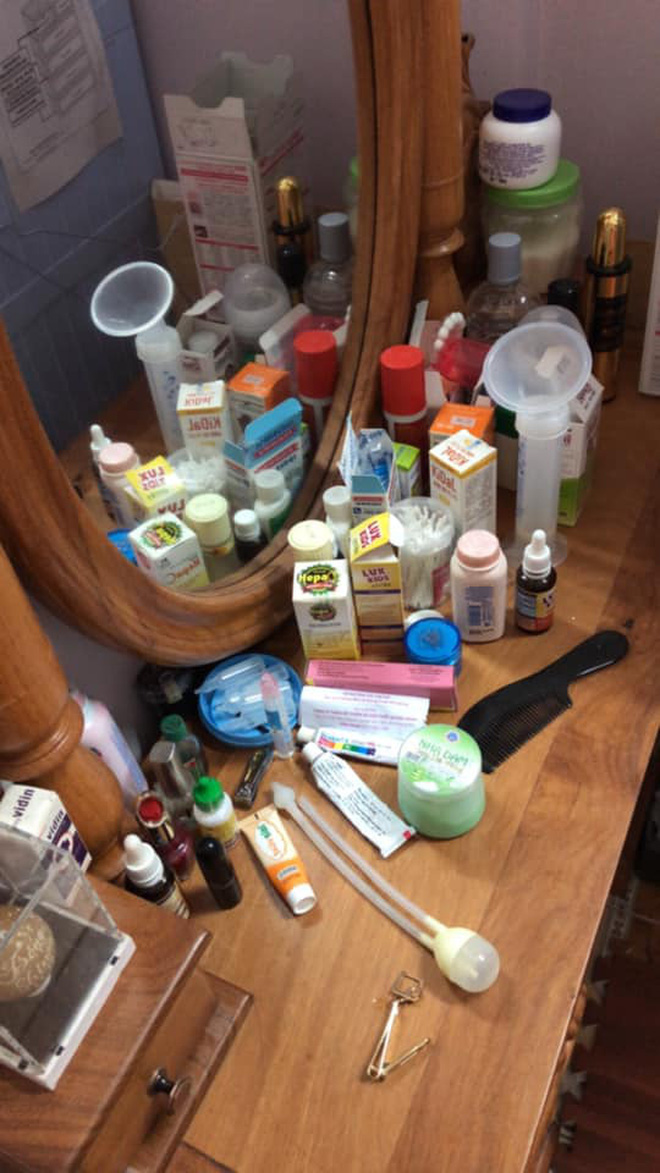 Kèm theo đó là hình ảnh chiếc bàn phấn để toàn đồ dùng của trẻ sơ sinh như hộp sữa bột, bình đựng sữa, thuốc nhỏ mũi... Bên dưới gầm bàn là phích nước nóng, máy hâm sữa... Dù nhiều đồ đạc nhưng mọi thứ cũng được sắp xếp khá gọn gàng.