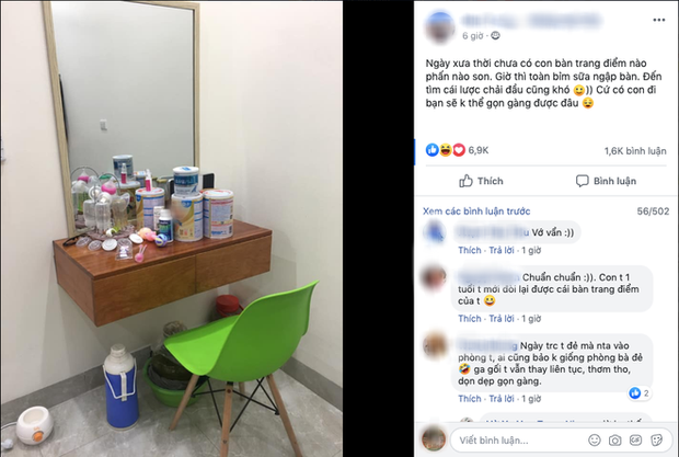 Tài khoản N.T đăng tải hình ảnh chiếc bàn phấn của mình kèm theo dòng chia sẻ: "Ngày xưa thời chưa có con, bàn trang điểm nào phấn nào son. Giờ thì toàn bỉm sữa ngập bàn, đến tìm cái lược chải đầu cũng khó. Cứ có con đi bạn sẽ không thể gọn gàng được đâu".