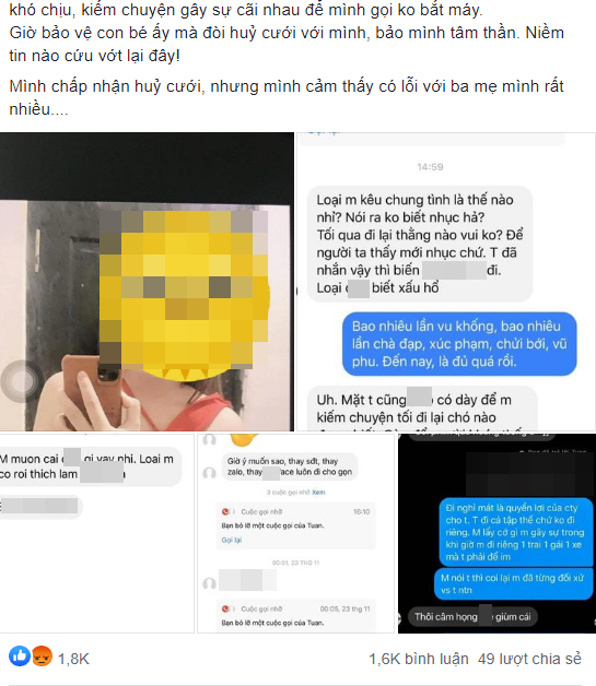 Đây là câu chuyện do cô gái đăng tải, đi kèm chính là hình ảnh về sự bội bạc của gã chồng sắp cưới dành cho. Theo đó, người chồng này luôn muốn gần gũi với người phụ nữ khác nhưng hễ ai đến gần vợ thì chửi bới, lăng mạ cô.