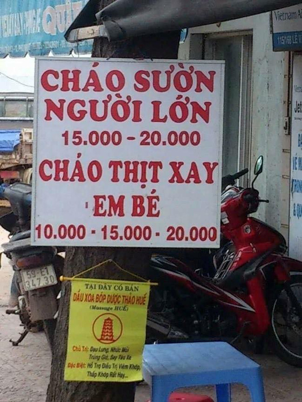 Tấm bảng quảng cáo này đề dòng chữ: "Cháo sườn người lớn. Cháo thịt xay em bé". Đọc thì chắc nhiều người sẽ hiểu quán bán cháo sườn dành cho người lớn với giá từ 15.000 - 20.000 đồng, còn cháo thịt xay cho trẻ em có 3 mức giá là 10.000 - 15.000 và 20.000 đồng.