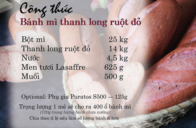 Để làm ra khoảng 400 ổ bánh mì, trọng lượng bánh chưa nướng là 120gr/ổ, đơn vị này sử dụng 25kg bột mì, 14kg thanh long ruột đỏ (đã bỏ vỏ), 4,5kg nước, 625gr men tươi Lasaffre, 500gr muối, 125gr phụ gia Puratos S500 (không bắt buộc).