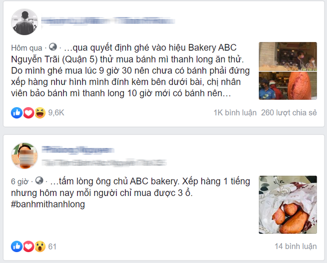 "Tôi đã mua 4 ổ bánh về ăn thì thấy bánh ngon, màu lạ và giá cũng rẻ. Nhược điểm duy nhất là nhiều khi đến nơi thì bánh đã hết, phải chờ mẻ mới ra lò hoặc phải xếp hàng chờ từ 15 phút trở lên mới mua được", tài khoản Minh Anh chia sẻ trên Facebook.