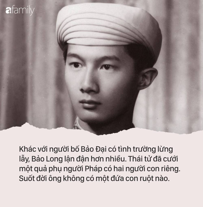 Khác với người bố Bảo Đại có tình trường lừng lẫy, Bảo Long lận đận hơn nhiều. Thái tử đã cưới một quả phụ người Pháp có hai người con riêng. Suốt đời ông không có một đứa con ruột nào.
