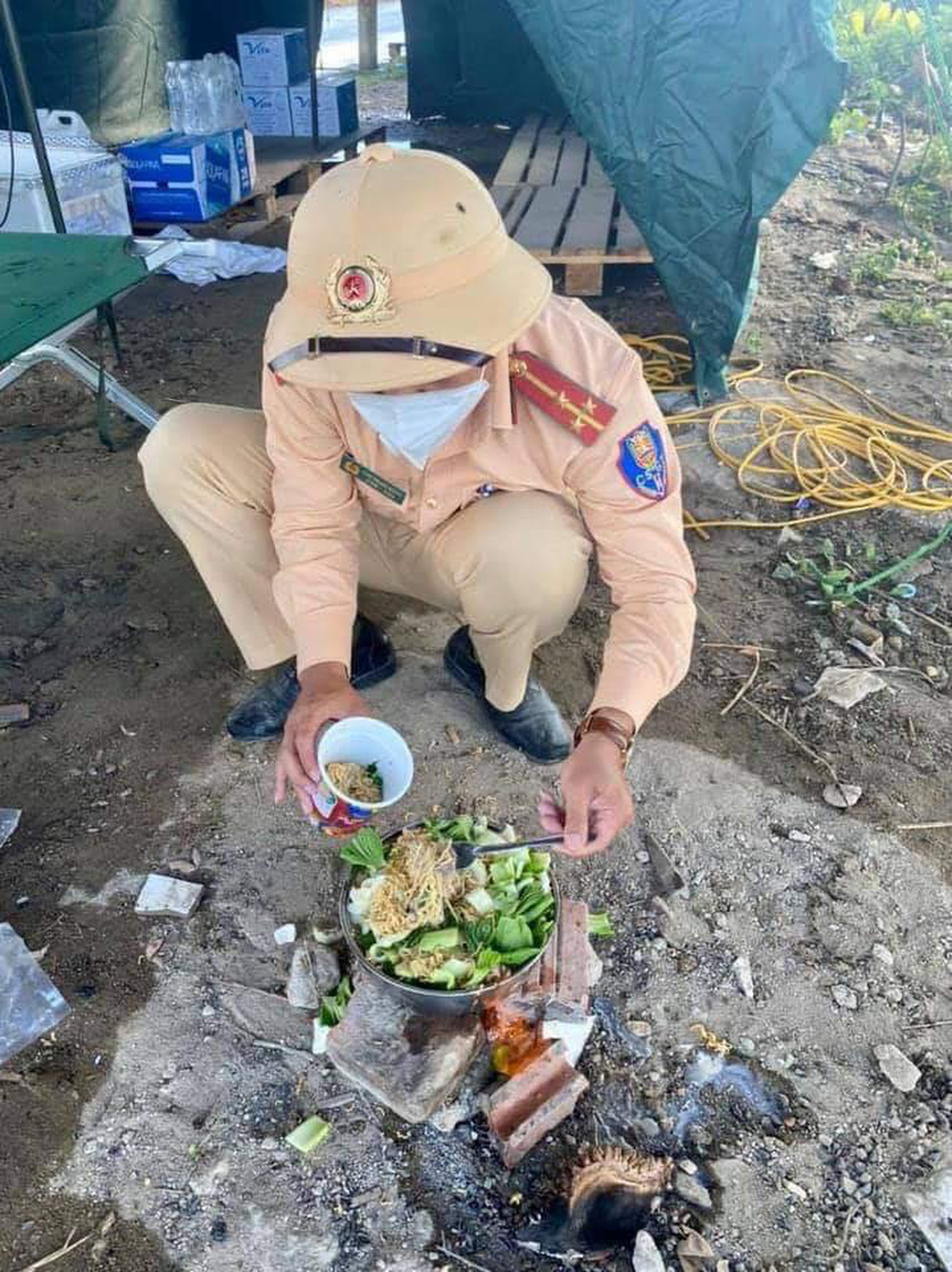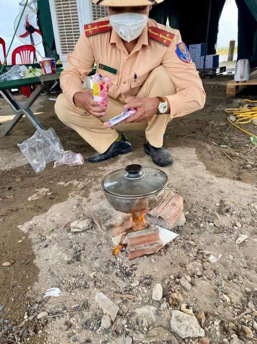 Có lẽ vì thế, xem bức ảnh chụp khoảnh khắc các chiến sĩ CSGT tại TP. Vinh ăn nồi mì tôm "độn toàn rau", nhiều người đã không khỏi cay khóe mắt. Nồi mì được nấu trên chiếc bếp tự chế bằng mấy viên gạch kê còn hộp mì được trưng dụng để làm bát. Các chiến sĩ tỏ ra vui vẻ, hạnh phúc với bữa ăn ngon lành này.
