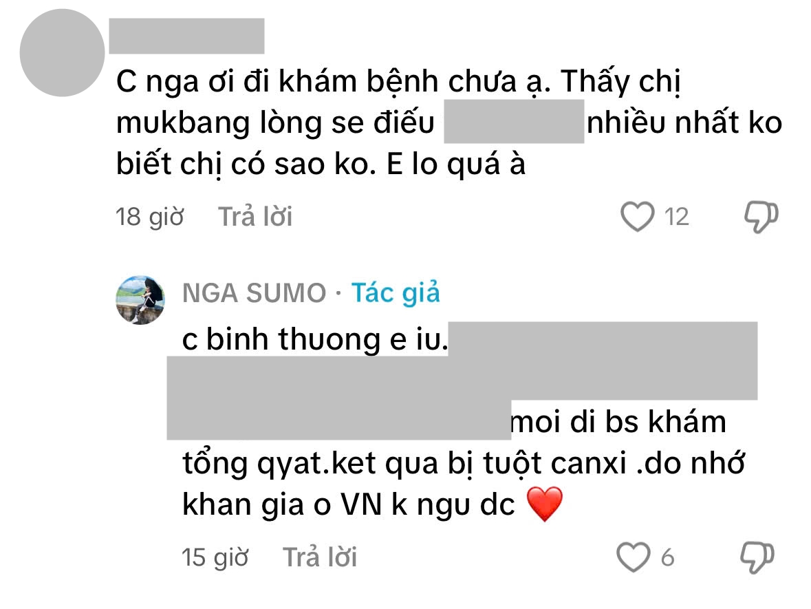 Nga Sumo không phải là TikToker hay YouTuber đầu tiên ăn hay quay clip review lòng se điếu, song vì cô ăn với số lượng lớn nên đang được netizen quan tâm nhiều hơn. Đặc biệt là về tình hình sức khỏe hiện tại của Nga Sumo. Thế nên, nhiều cư dân mạng, đặc biệt là người hâm mộ đã tràn vào tài khoản mạng xã hội của nữ TikToker này để hỏi han.