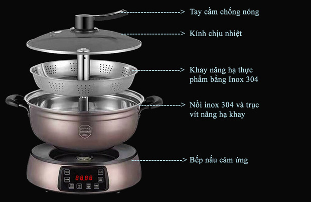 Được biết, sản phẩm này có tên là nồi lẩu "thang máy", hiện đang được bày bán phổ biến trên các trang thương mại điện tử với giá dao động từ 1,3 - 2 triệu đồng tuỳ loại. Tính năng nổi bật của nó là khay đựng thức ăn dạng lưới có khả năng xoay tròn và nâng lên, giúp chúng ta dễ dàng gắp các loại nguyên liệu bên trong.