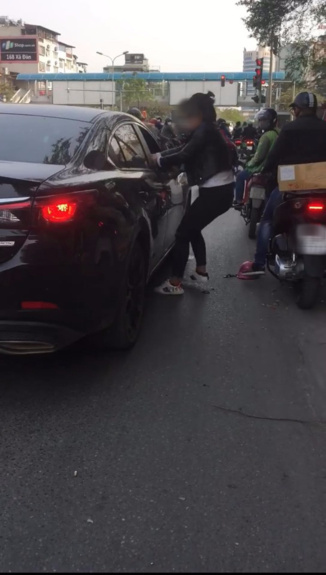 Theo đó, người phụ nữ mặc áo da màu đen, tóc ngắn (được cho là vợ của người đàn ông ngồi trên ô tô) liên tục quát lớn, yêu cầu chồng dừng xe và bắt phải xuống xe nói chuyện. Cùng với đó, người phụ nữ này ra sức kéo áo cô gái lạ trên xe cùng chồng kèm lời quát: "Xuống ngay, xuống ngay xe nói chuyện".
