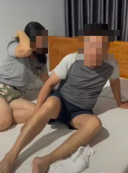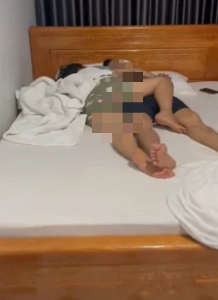 Theo nội dung trong đoạn clip, người chồng đi cùng nhân viên khách sạn mở cửa một phòng nghỉ để kiểm tra thì phát hiện cô vợ đang ôm một người đàn ông lạ, "say giấc nồng" trên giường.