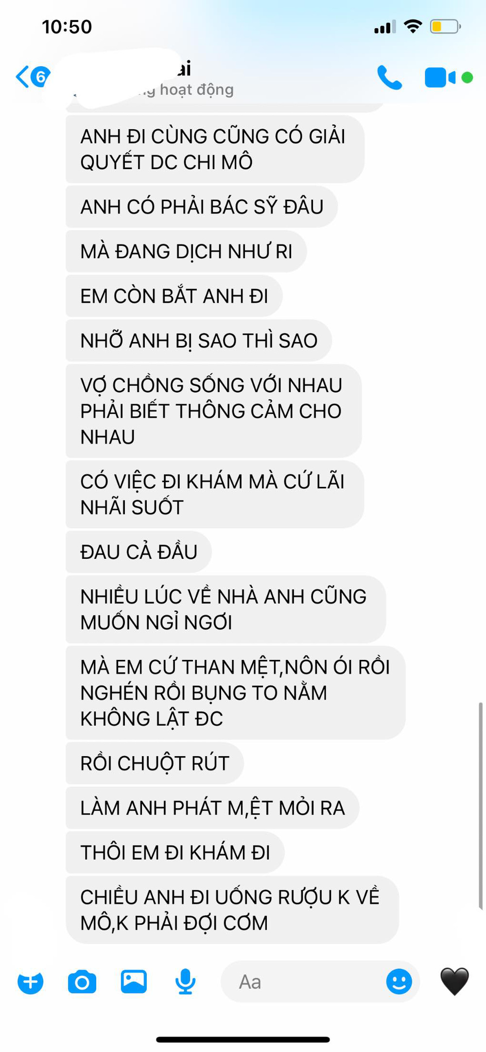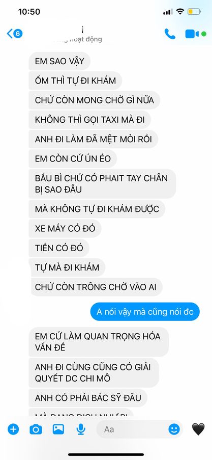 "Không đi thì gọi taxi mà đi. Anh đi làm đã mệt mỏi rồi, em còn cứ uốn éo. Bầu bí chứ có phải tay chân bị sao đâu mà không tự đi khám được".
