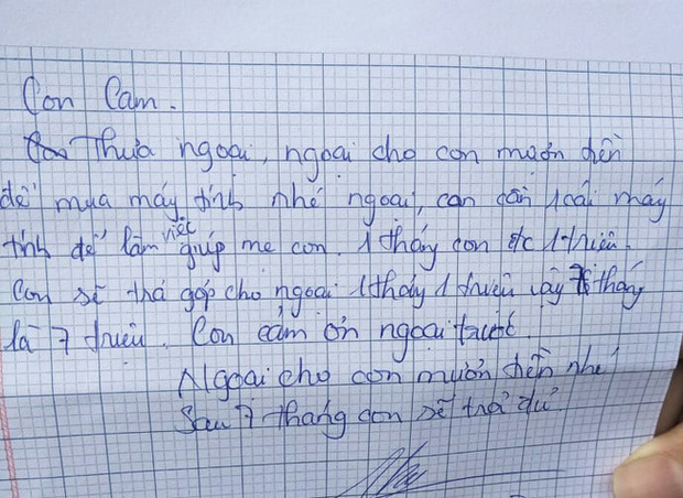 Không chỉ mượn "suông", cô bé còn vạch rõ chi tiết quá trình trả nợ. 7 triệu trả trong 7 tháng, 1 tháng 1 triệu, "con sẽ trả góp cho ngoại", bé viết.