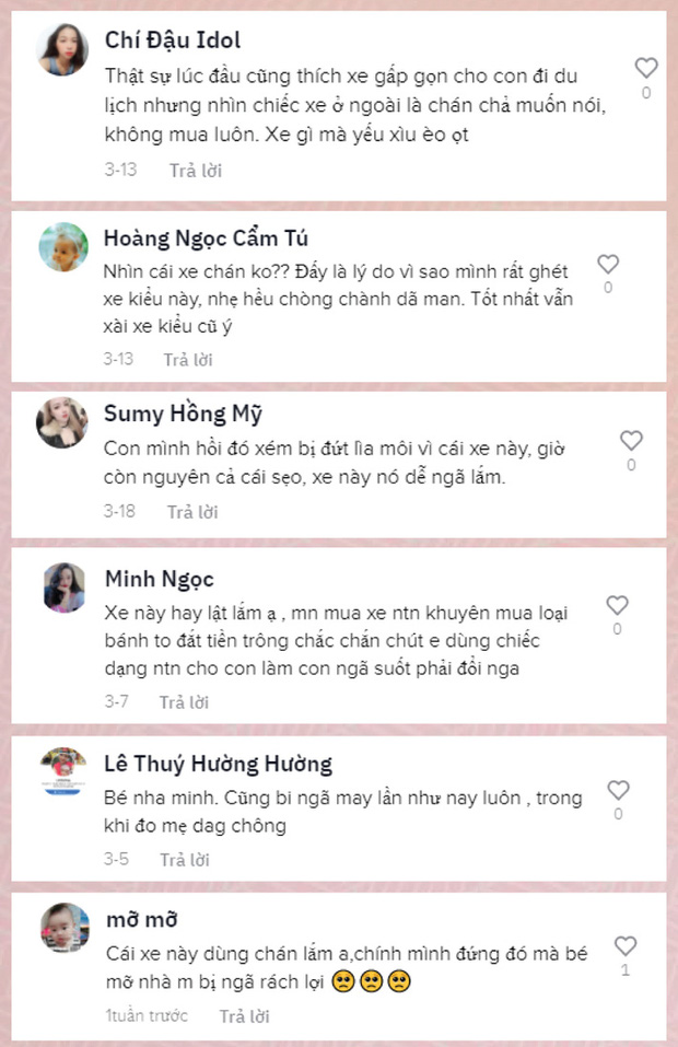 - "Xe này hay lật lắm ạ, mọi người mua xe như thế này khuyên nên mua loại bánh to đắt tiền, trông chắc chắn chút chứ em dùng loại như thế này cho con làm con ngã suốt, em phải đổi ngay."