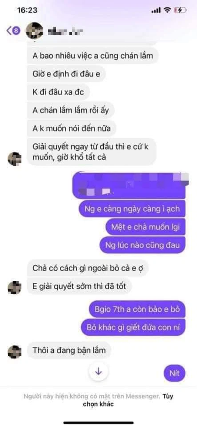 "Khi đấy con em trong bụng 7 tháng. Rồi nó bắt đầu đi rêu rao khắp nơi là em ngủ với trăm thằng biết là con ai. Em bảo nó đi xét nghiệm ADN nó bảo chi phí như thế nào - 23 triệu thì nó bảo nó không có tiền. Em bảo bây giờ tiền xét nghiệm là do em trả, nếu đúng con nó nó phải trả lại tiền xét nghiệm và cho em một lời xin lỗi từ chính miệng của nó. Nhưng cuối cùng nó vẫn hèn nhát không đi xét nghiệm".