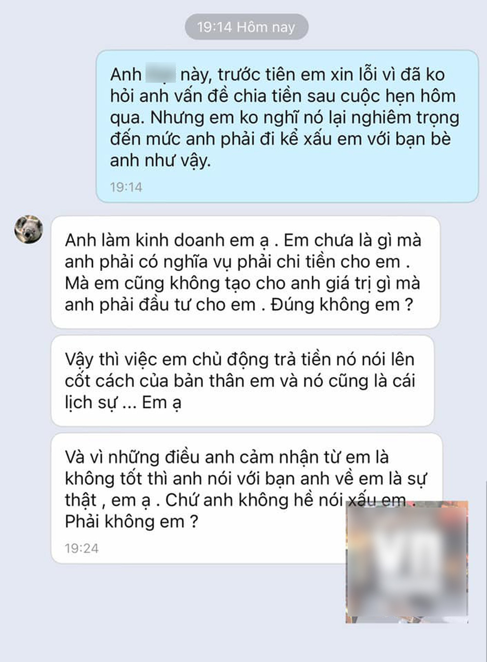 Khi nhắn tin hỏi thẳng, Đ cho rằng cô gái không tạo ra giá trị gì để phải đầu tư và không có nghĩa vụ phải chi tiền. Anh chàng còn thẳng thắn: "Việc chủ động chia tiền nói lên cốt cách của bản thân em và nó cũng là cái lịch sự". Phải nghe những câu nói nặng nề, cô gái đã trả lại Đ 35.000 đồng tiền sinh tố cùng 75.000 đồng tiền xăng xe.
