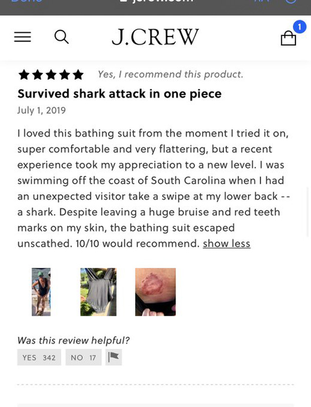 Tôi đang đi bơi ở vùng biển thuộc Bắc Carolina thì bị một con cá mập cắn vào lưng. Ấy vậy mà bộ đồ bơi kia không hề bị rách, phát huy khả năng bảo vệ người dùng tối đa khiến tôi chỉ bị bầm và một vài vết răng đỏ. Tôi chấm sản phẩm này 10/10" - trích đoạn review trên trang web bán đồ bơi của người phụ nữ. Không rõ làm cách nào mà người phụ nữ có thể bảo toàn tính mạng mà trở về viết review nhưng dù sao kết quả này cũng khiến mọi người nhẹ nhõm.