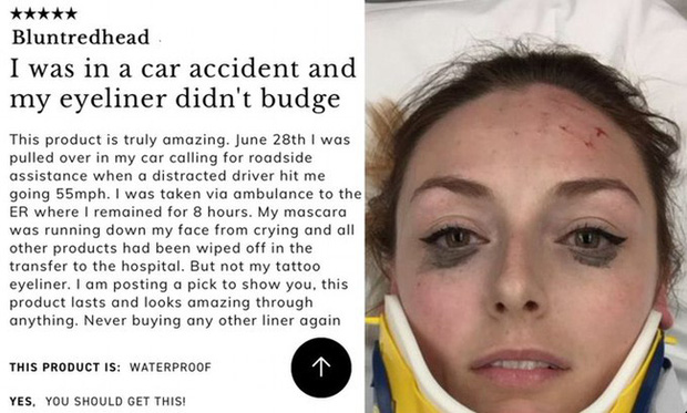 Vụ tai nạn khiến Shelby mếu máo làm trôi đi mascara và nhiều lớp trang điểm cũng bị bay đi trong quá trình cô được đưa đến bệnh viện, chỉ trừ lớp kẻ mắt. Thế là sau khi hồi phục, Shelby đã lên mạng review, chia sẻ cho chị em sản phẩm kẻ mắt bám bền bỉ ngay lập tức, thề sẽ trung thành với nó suốt đời.