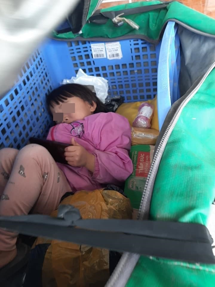 Cô con gái bé nhỏ (khoảng 4 tuổi) nằm gọn gàng bên trong túi giao hàng cùng với chiếc điện thoại, ngoan ngoãn theo chân bố đi làm. Hình ảnh này được một khách hàng chụp lại và đăng tải trên mạng xã hội, theo người này vì nhà không có người trông con nên ông bố này đã quyết định đưa con theo mình để tiện bề trông nom và chăm sóc.