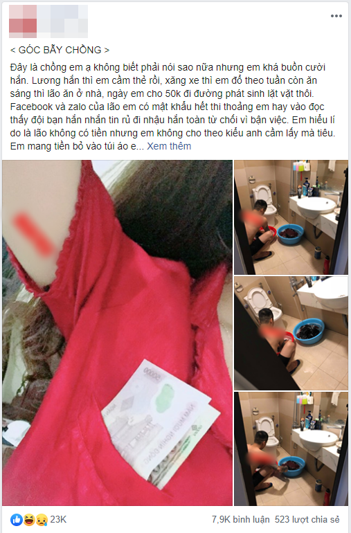 "Đây là chồng em ạ! Không biết phải nói sao nữa nhưng em khá buồn cười hắn. Lương hắn thì em cầm thẻ rồi, xăng xe thì em đổ theo tuần còn ăn sáng thì lão ăn ở nhà, ngày em cho 50k đi đường phát sinh lặt vặt thôi.