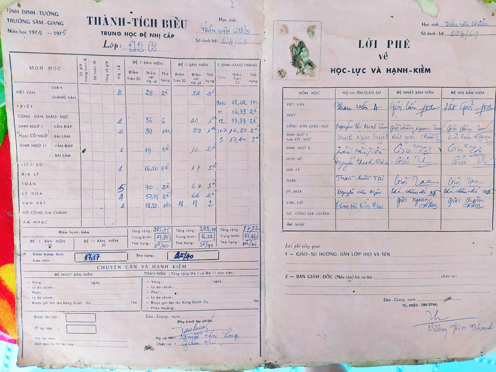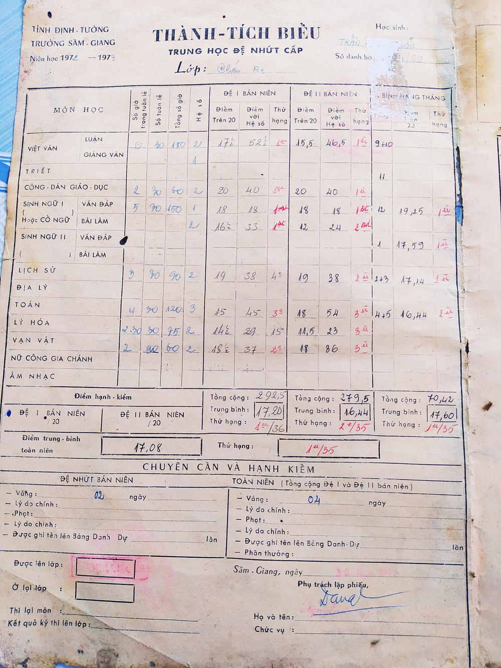 Lời phê của giáo viên về học lực cũng như hạnh kiểm của ông bố như sau: "Học yếu, chưa chăm học. Ý thức tổ chức kỷ luật yếu. Hạnh kiểm trung bình".