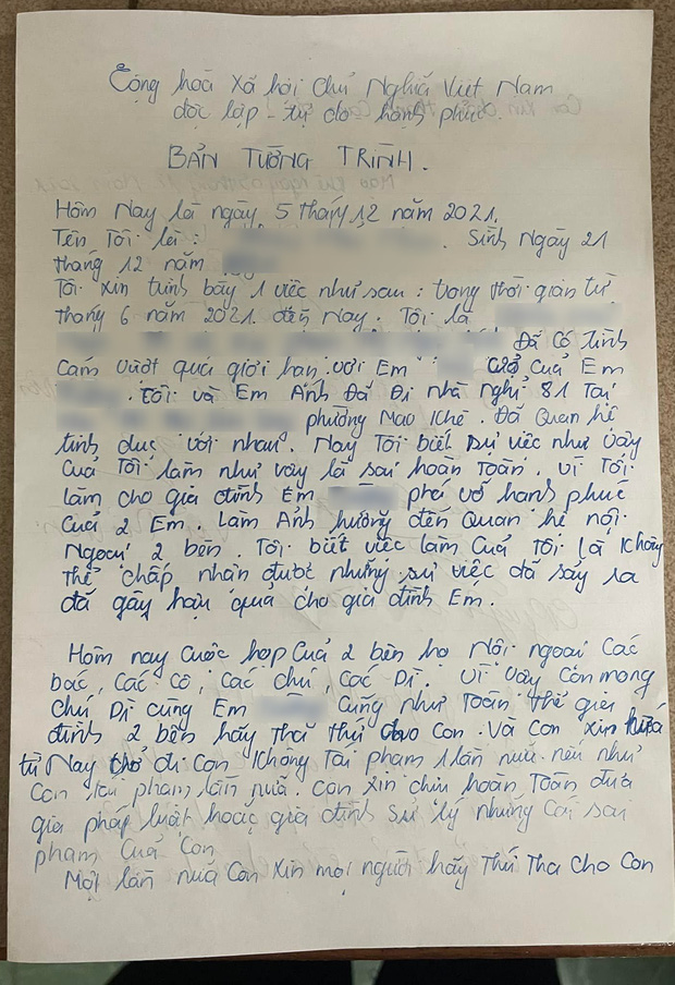 “Từ tháng 6/2021 đến nay. Tôi là P.H.N và em P.T.N.A đã có tình cảm vượt quá giới hạn. Em A. là vợ của em T. Tôi và em A. đã đi nhà nghỉ ở Mạo Khê và quan hệ tình dục với nhau”, người đàn ông đọc to rõ ràng giữa cả gia đình.