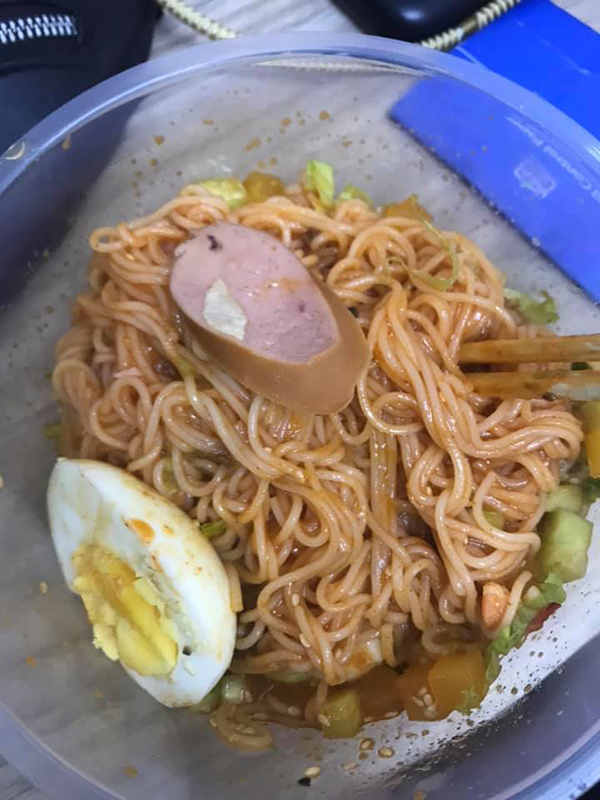 Kèm lời than thở là hình ảnh bát mì cay không khác gì bát mì tôm bình thường, có thêm nửa quả trức, 1 miếng xúc xích và ít dưa chuột thái nhỏ.