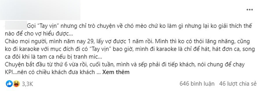 Mình về thì cũng chỉ bảo đi tiếp khách. Thế nào hôm sau, lộ ra chuyện mình đi ăn rồi hát karaoke “tay vịn”, mình cũng có 1 em “tay vịn” nhưng mình giải thích là: