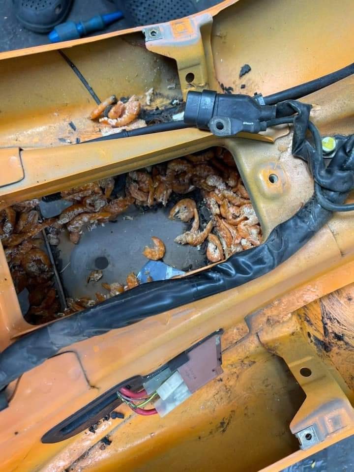 Chiếc xe ga vốn là phương tiện di chuyển nhưng bây giờ nó lại biến thành hang ổ của bọn chuột và ở ngay đây, cô đã tìm được bịch tôm khô của mình. Tất cả mọi ngóc ngách bên trong chiếc xe đều lấp đầy bởi những miếng tôm nhỏ xíu, từ chỗ trống dưới vỏ xe, đến khoảng không gian nhỏ để luồn dây điện đâu đâu cũng toàn tôm là tôm.