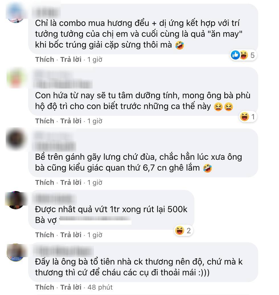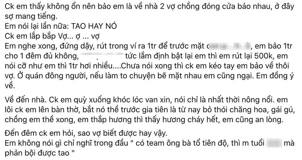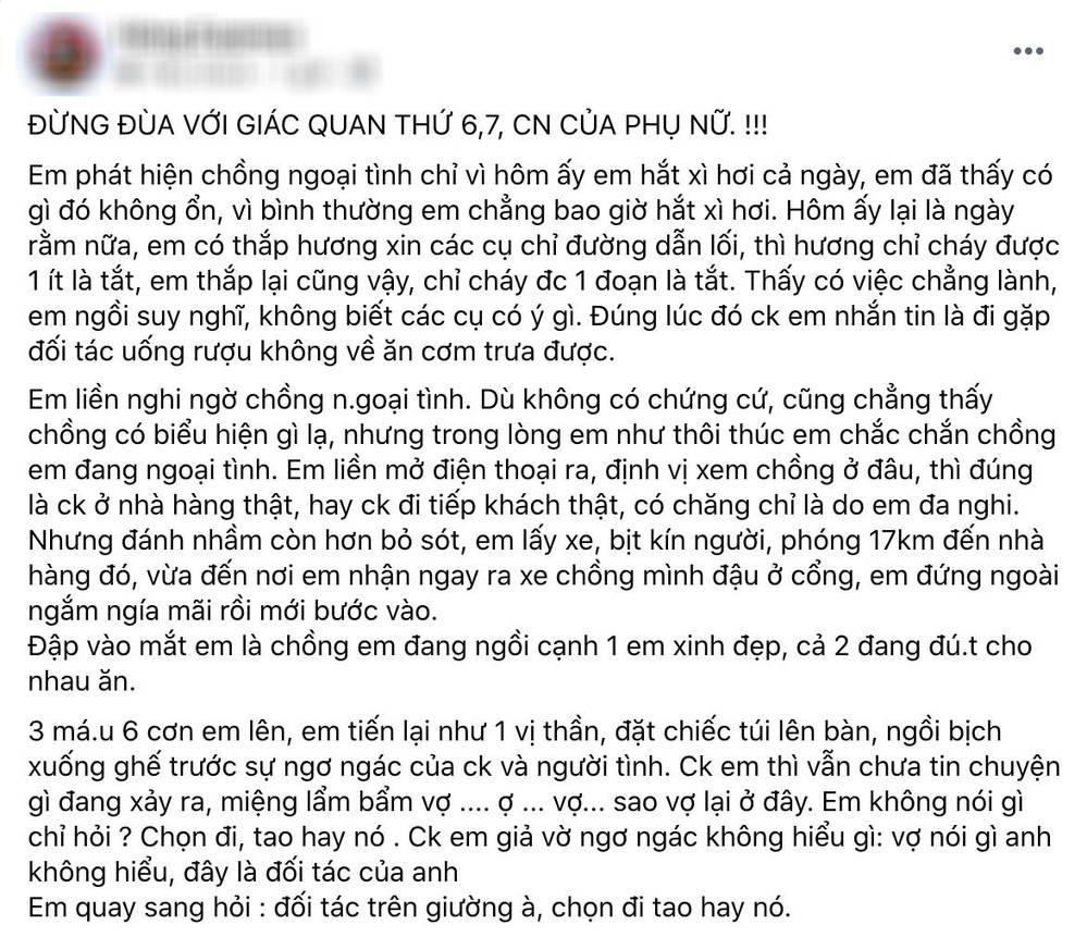 Cụ thể, cô vợ đã chia sẻ câu chuyện “bắt tại trận” chồng ngoại tình lên mạng xã hội . Điều đáng nói, quá trình này lại là một loạt những yếu tố “ tâm linh ” đòi hỏi người phụ nữ phải phát huy khả năng nhạy bén của giác quan thứ 6 . Theo đó, vào ngày rằm, cô thắp hương nhưng cứ cháy được một chút là lại tắt. Chưa kể, một người bình thường chẳng bao giờ hắt xì hơi như cô nay lại cứ hắt hơi liên tục cả ngày.