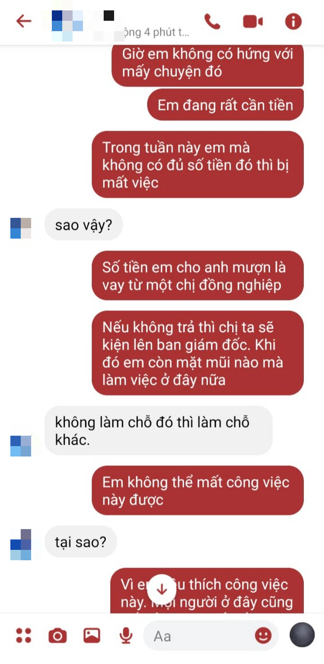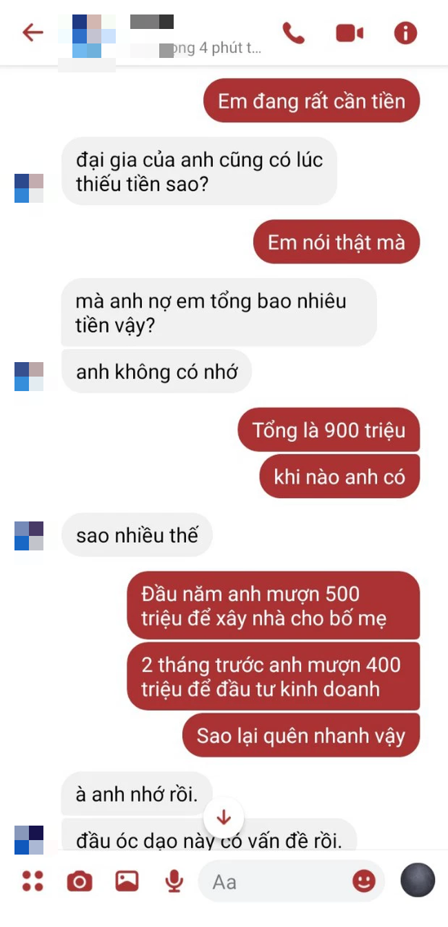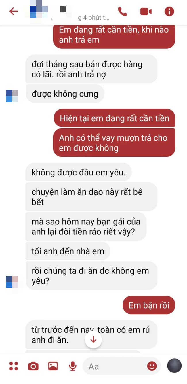 Biết rằng tình cảm đã không còn hi vọng gì, cô cũng chỉ mong bản thân có thể lấy lại số tiền mình đã cho vay. Vậy là cô nhắn tin luôn cho người yêu để đòi tiền với lý do cần gấp. Dưới đây là toàn bộ ảnh chụp cuộc đối thoại của cả hai.