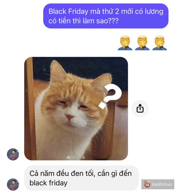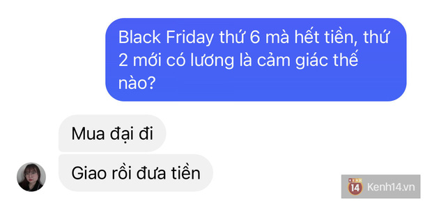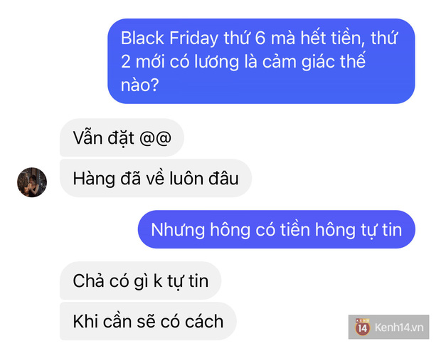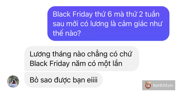 Tuy nhiên, đời thỉnh thoảng cũng hay trêu ngươi người ta. Sẽ ra sao nếu nay Black Friday mà tới tuần sau bạn mới có lương? Bạn hiểu hông, nghĩa là giờ phút cuối tháng này, tài chính của bạn đã tới mức cạn kiệt rồi mà giỏ đồ bạn định mua vẫn chất đầy đấy. Đó là cảm giác gì và phải giải quyết ra sao, cùng chat nhanh với một vài nam thanh nữ tú để biết câu trả lời nhé!