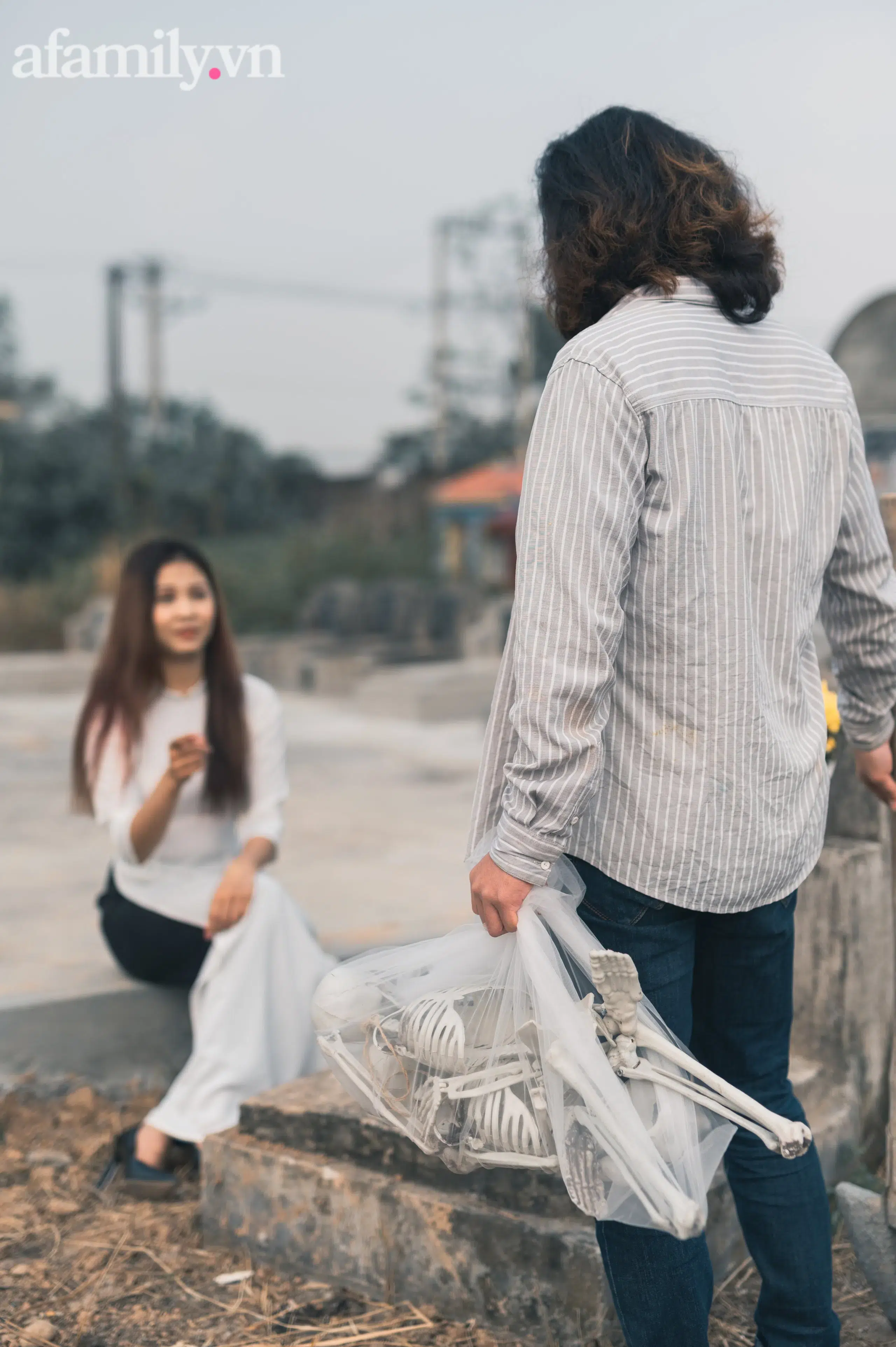 Bộ ảnh cũng được ekip thực hiện ở 1 nghĩa trang Sơn Tây - bởi đây là nơi lần đầu cô dâu, chú rể gặp nhau. Anh Jin chia sẻ thêm: "Mới đăng mấy bức ảnh hậu trường nhưng bên mình cũng nhận được nhiều luồng ý kiến. Có người khen có người nói 'không nên làm vậy vì nó là vấn đề tâm linh'. Nhưng trong suốt quá trình làm việc bọn mình không mạo phạm những người đã khuất, ngôi mộ được chọn chụp ảnh cũng là mộ không tên. Mình rất tôn trọng mong muốn của cô dâu chú rể và trân trọng câu chuyện tình yêu của họ".