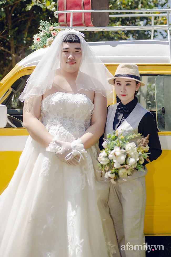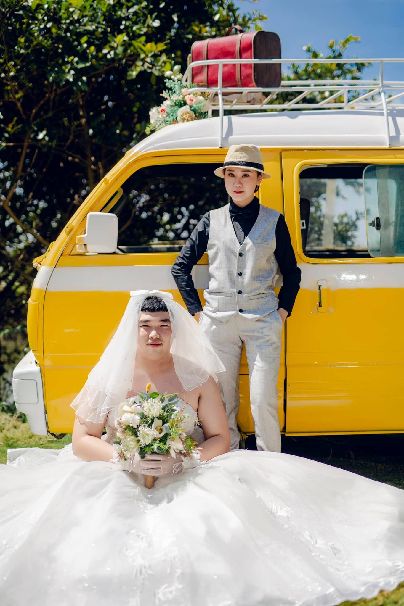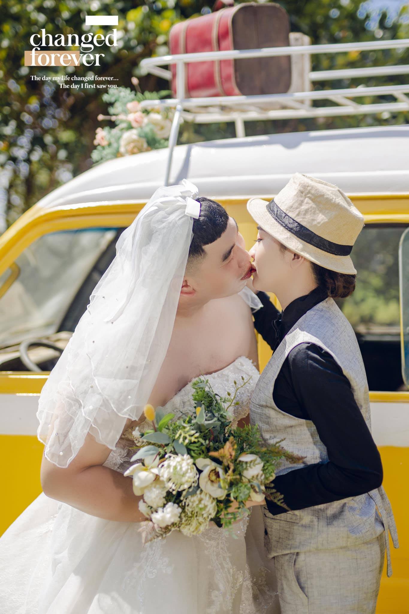 Mới đây, bộ ảnh cưới của một đôi cô dâu chú rể đã gây chú ý lớn với cộng đồng mạng. Trong những bức hình, chú rể thay vì mặc vest thì mặc váy cô dâu, tạo dáng e lệ. Cô dâu diện vest. Cả hai tráo đổi vị trí cho nhau.