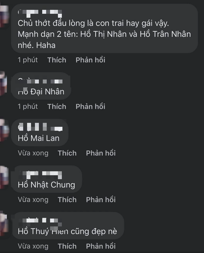 Những cái tên như: Hồ Thúy Hiền, Hồ Đại Nhân, Hồ Mai Lan, Hồ Nhật Chung,... đều rất đẹp và ý nghĩa mà nhiều cư dân mạng "có tâm" nghĩ hộ ông bố. Tuy nhiên, bên cạnh đó cũng không ít những bình luận "trêu trọc" đặt tên theo "trend" khiến người đọc "cười xái hàm" vì quá hài hước và sáng tạo, điển hình như: Hồ Nương Tựa, Hồ Anh Em, Hồ Hiền Nhân, Hồ Khởi Nghiệp Gofl,... nhằm đáp ứng yêu cầu "cho sang, giàu" của ông bố đề ra ở bên trên.